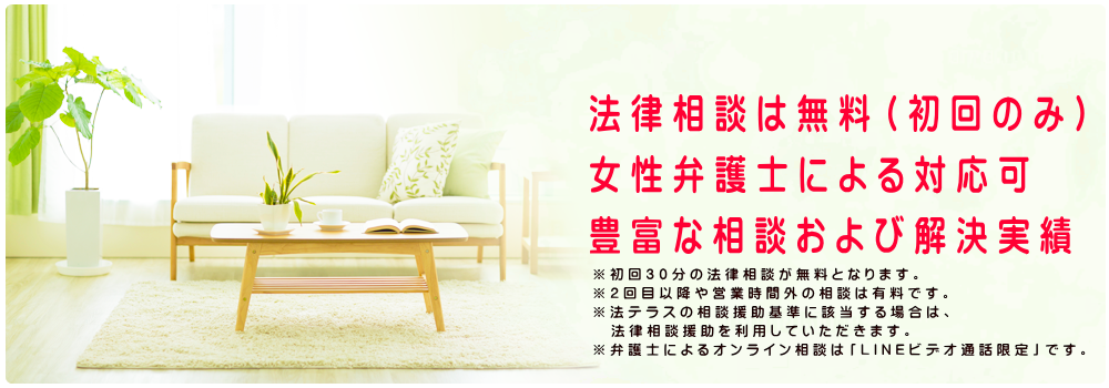 夫から暴力を受けて男性と対面するのが怖いなどのDV被害で悩まれている女性の方でも安心して、離婚や慰謝料などの法律相談を受けることができます。